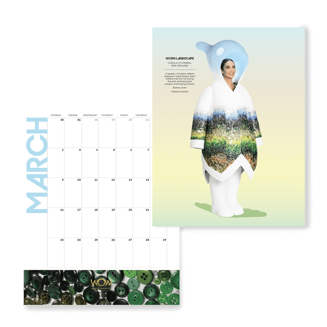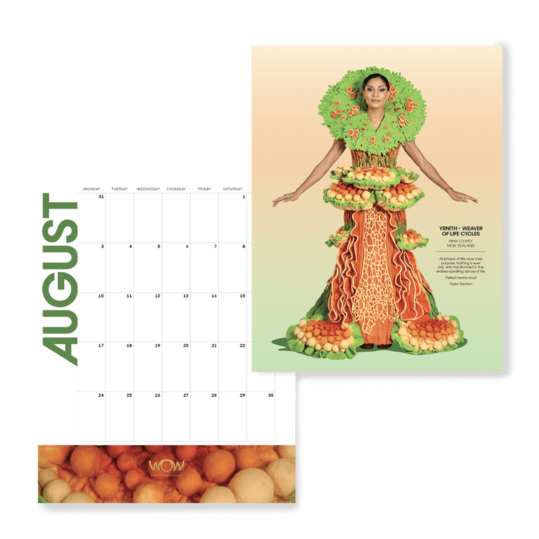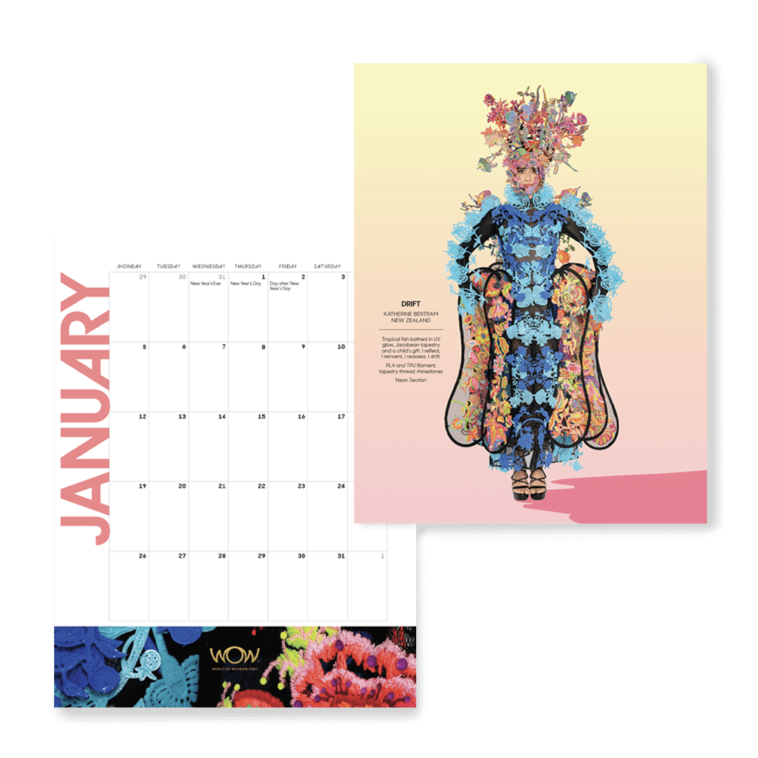 The 2026 WOW Calendar celebrates the creativity and innovation of a selection of this year’s finalist garments. Each month features an extraordinary design that pushes the boundaries of art and imagination. Stitch bound with gold foil detail on cover. Dates include New Zealand holidays.
